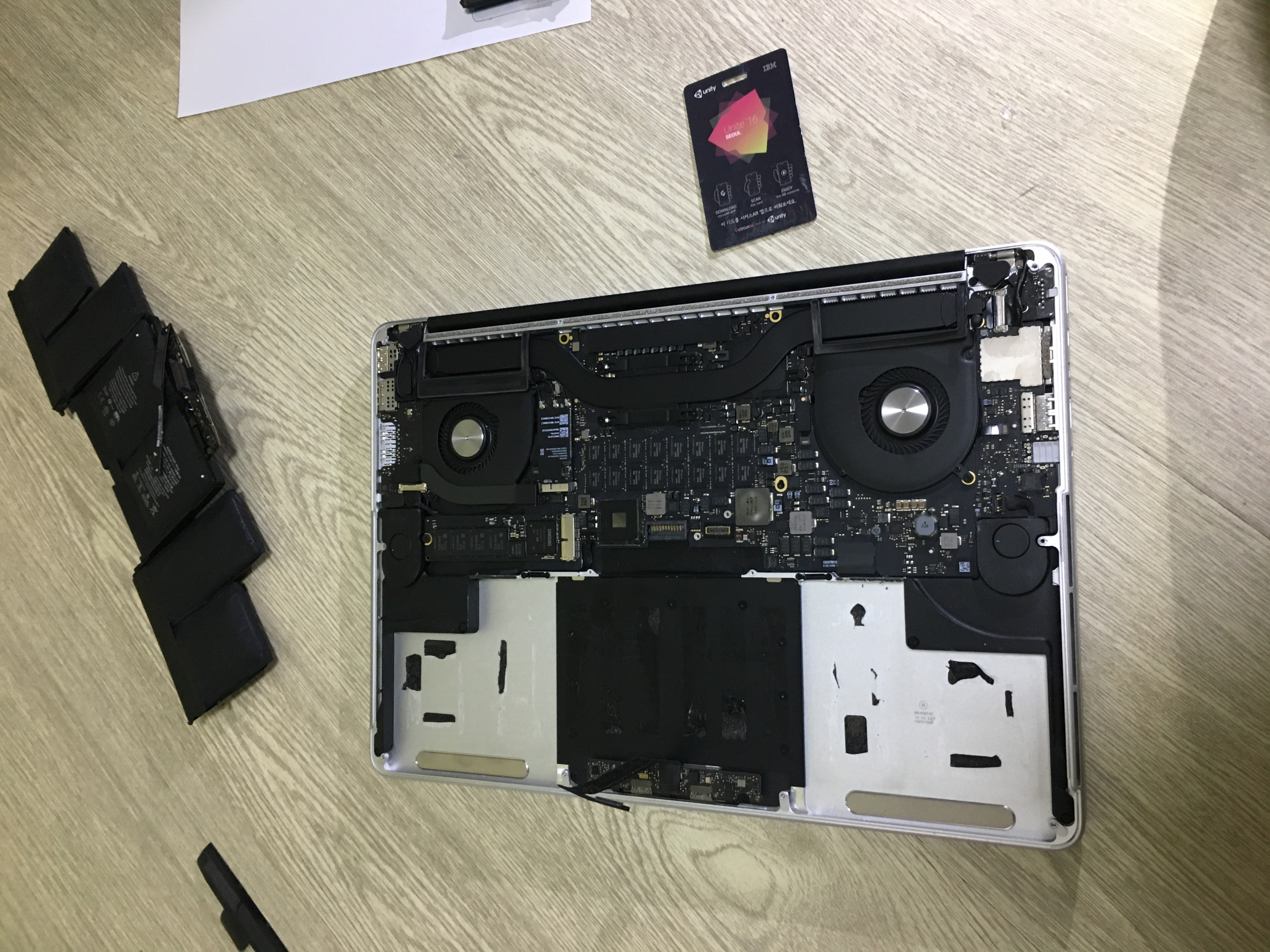 일단은 기존 배터리를 제거해야 했다. 배터리와 본체가 양면테이프로 대단히 세게 붙여 있으므로 유튜브를 보니 다른 사람들은 껌때기 같은 도구가 있었지만 지금 현 상태에선 구하기가 어려웠으므로 주변에 돌아댕기는 얇은 플라스틱 출입증 카드를 이용하기로 했다. 유니티 고마워요!
