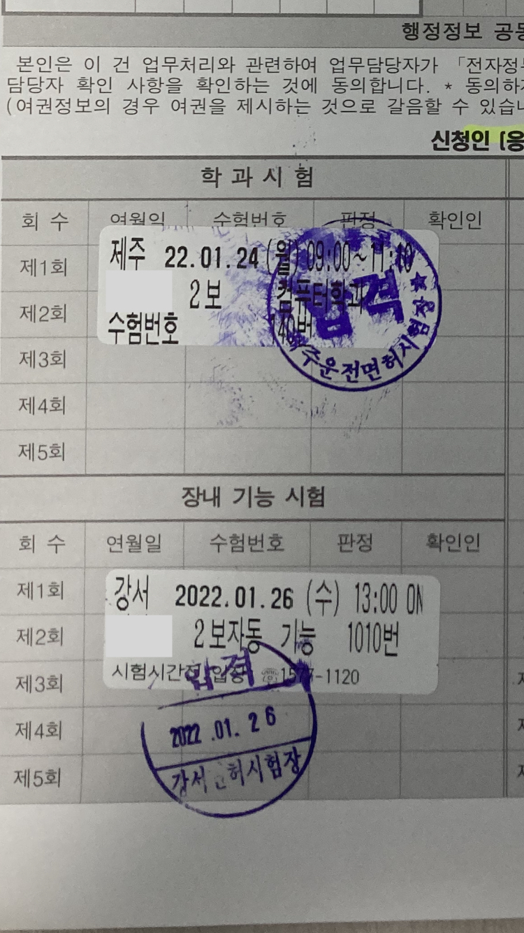 2종 보통(오토) 면허를 한번에 붙었습니다.