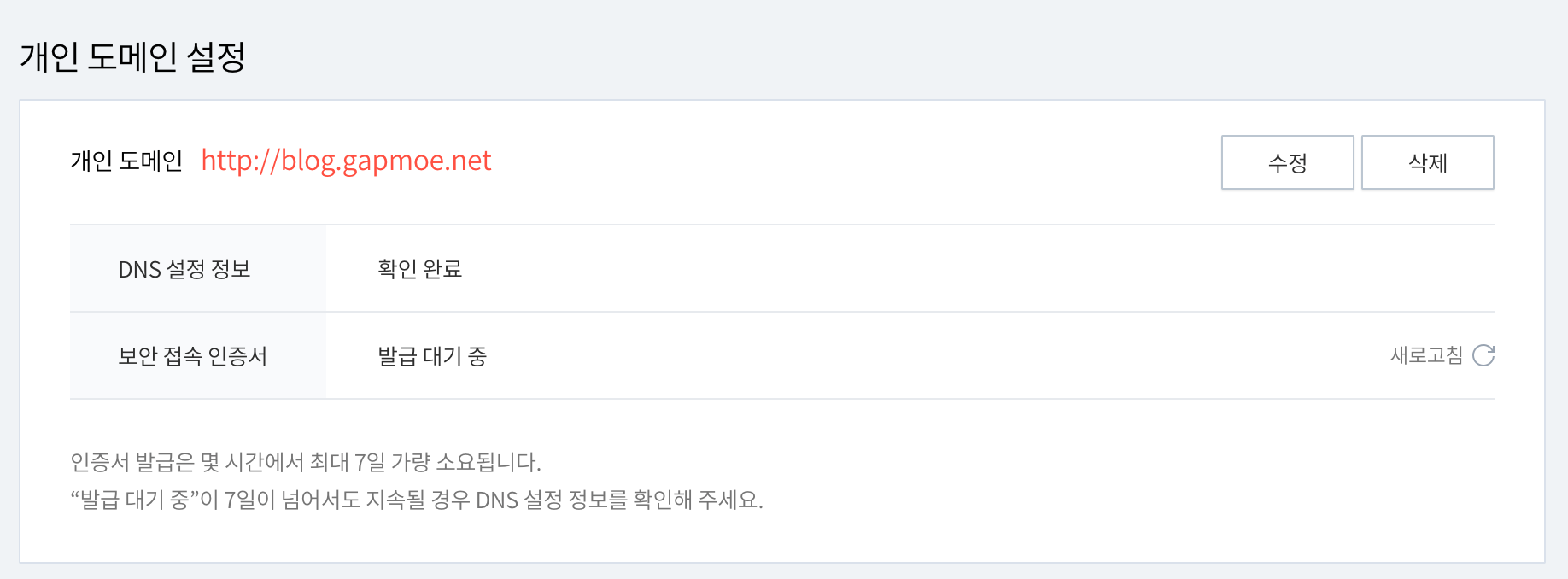 인증서 발급은 티스토리에서 자동으로 진행하니 기다려주시면 됩니다.