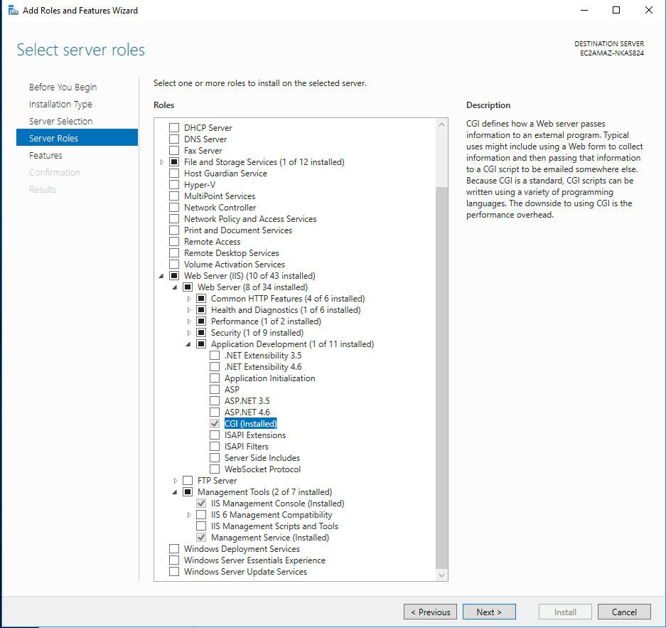 Server Manager > Add roles and features > IIS > Management Service + CGI 선택 후 설치 진행 하면 일단은 IIS 와 CGI 설치가 자동으로 진행된다. 이 후 웹 브라우저로 localhost 접속 시도를 하여 테스트 페이지가 표시되는지 확인 하면 된다.